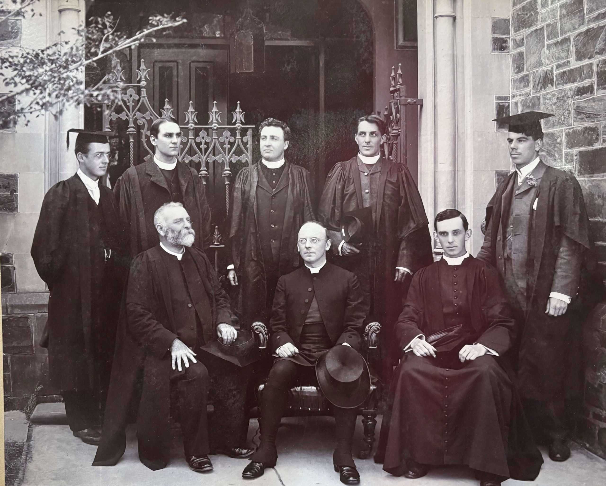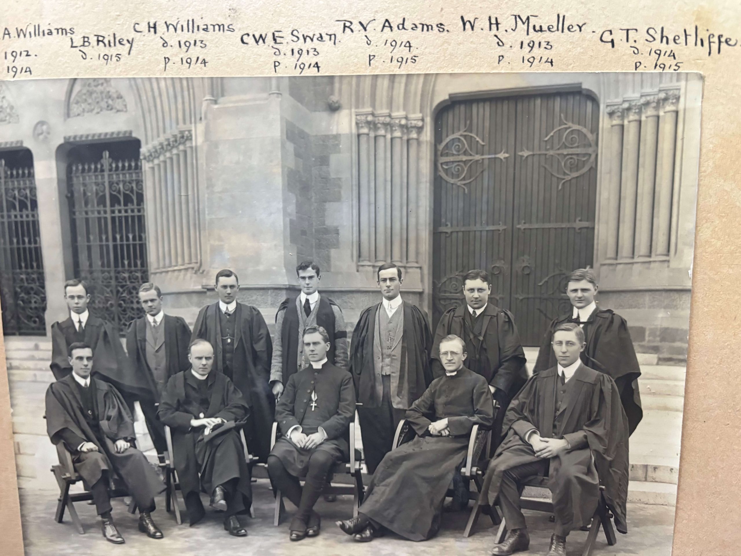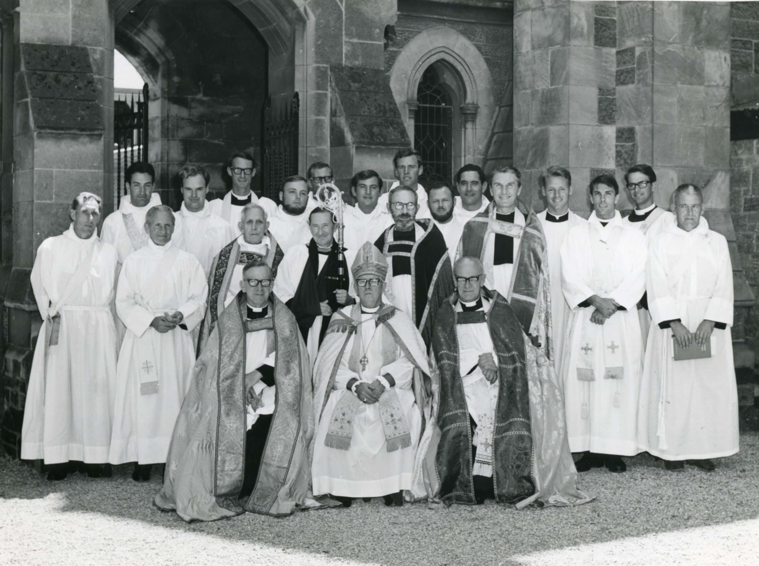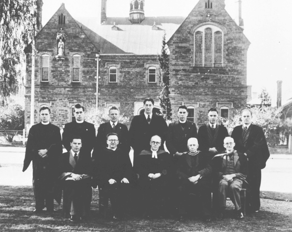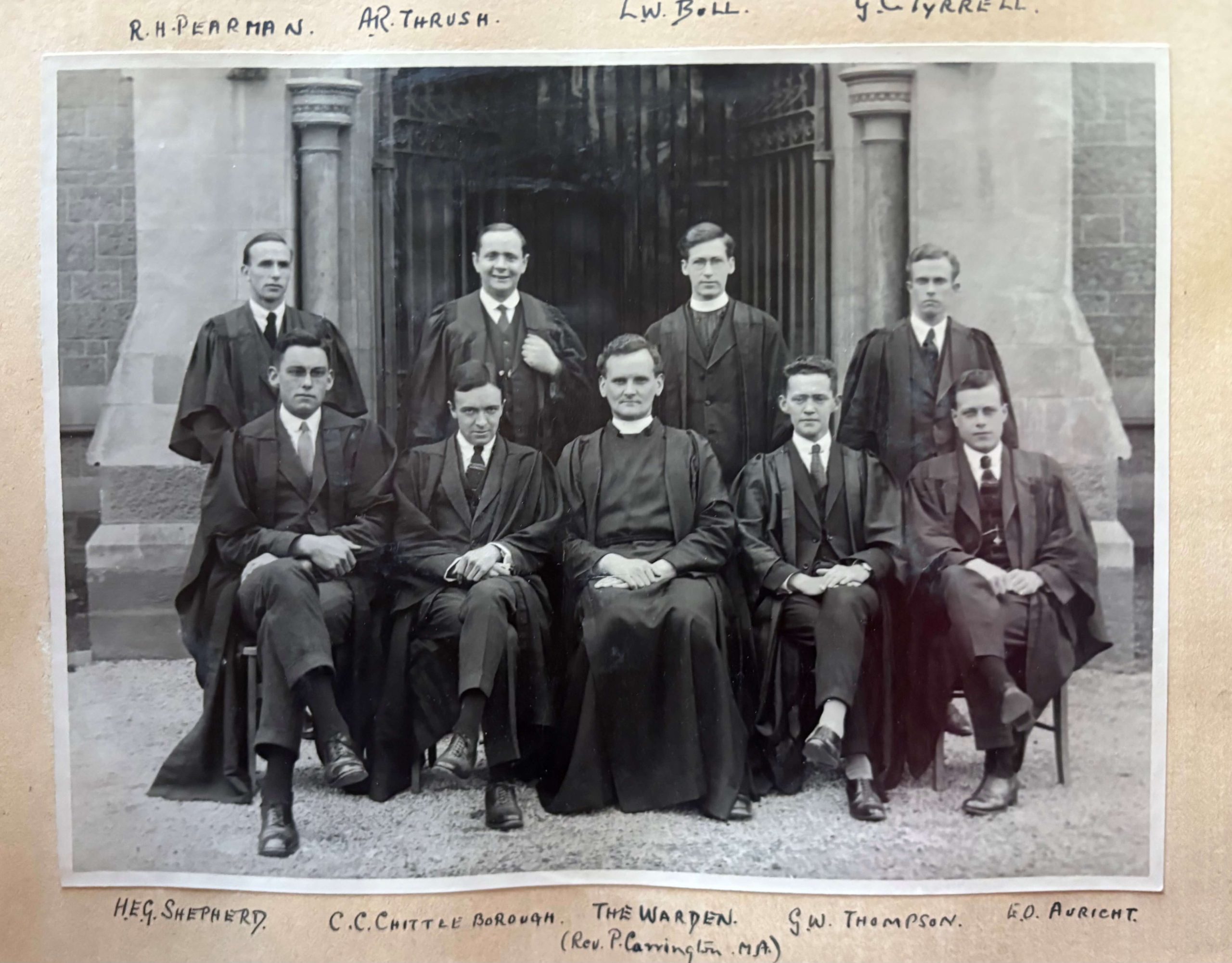 St. Barnabas’ College staff and students in 1950. L-r: Back: Rev. A.B.Williams; Rev.R.O.Nichols; L.G.Mauger; I.D.Stuart; Rev.W.H.Warnes; R.O.Herde; D.W.Brockhoff. Front: F.G.Hawkes; Rev.A.R.Bowens; Rev.J.W.Griffiths; Rev J.W.Clarke; Rev.N.Crawford.